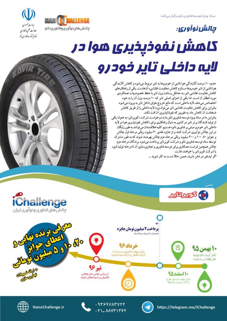 ستاد ویژه توسعه فناوری نانو معاونت علمی و فن آوری ریاست جمهوری بنا به درخواست شرکت «کویرتایر» به عنوان یکی از تولیدکنندگان برتر تایر در کشور، به دنبال راهکاری برای کاهش نفوذپذیری هوا در لایه داخلی تایر خودر بوده است که این امر را ازطریق برگزاری چالش نوآوری نانو در بین شرکتهای خلاق و نوآور، پژوهشگران، مخترعان و فناوران، اعضای هیات علمی و دانشجویان دانشگاهها و پژوهشگاهها از داخل و خارج کشور به انجام رسانید.