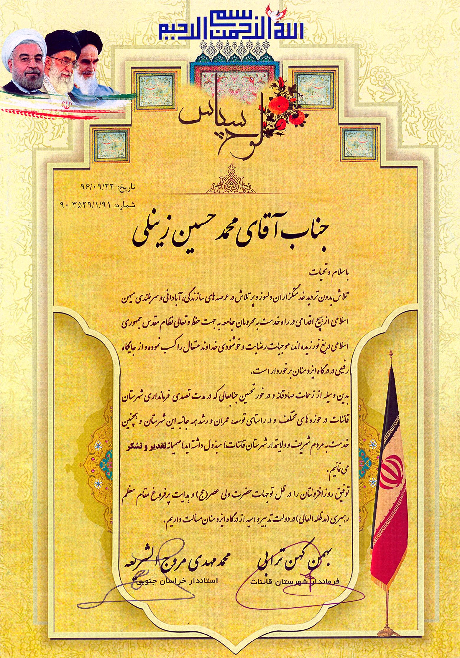 استاندار خراسان جنوبی و فرماندار قاینات در بخش دیگری از این تقدیرنامه آورده است: بدین وسیله از زحمات صادقانه و در خور تحسین جنابعالی که در مدت تصدی فرمانداری شهرستان قائنات در حوزه های مختلف و در راستای توسعه، عمران و رشد همه جانبه این شهرستان و همچنین خدمت به مردم شریف و ولایتمدار شهرستان قائنات، مبذول داشته اید، صمیمانه تقدیر و تشکر می نمائیم.
