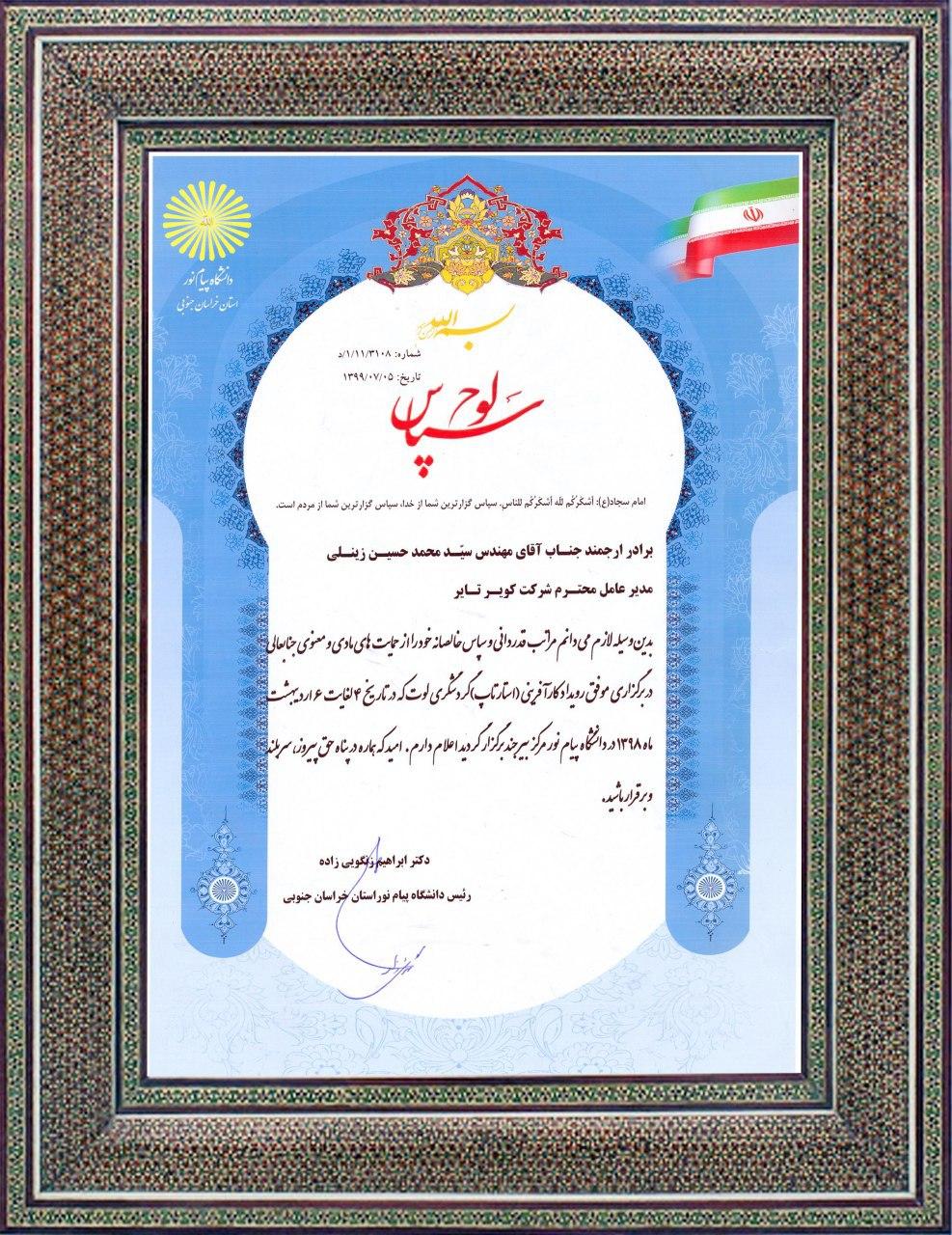 متن لوح تقدیر آقای دکتر ابراهیم زنگویی زاده رئیس دانشگاه پیام نورخراسان جنوبی به این شرح است.
