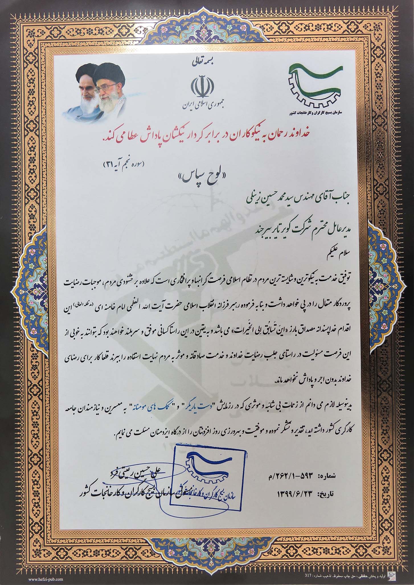 درادامه این تقدیرنامه آمده است لازم می دانم اززحمات بی شائبه وموثری که در رزمایش "دست یاریگر" وکمک های مومنانه " به معسرین و نیازمندان جامعه کارگری کشورداشته اید، تقدیرو تشکرنموده وموفقیت وبهروزی روزافزونتان راازدرگاه ایزدمنان مسالت می نمایم.