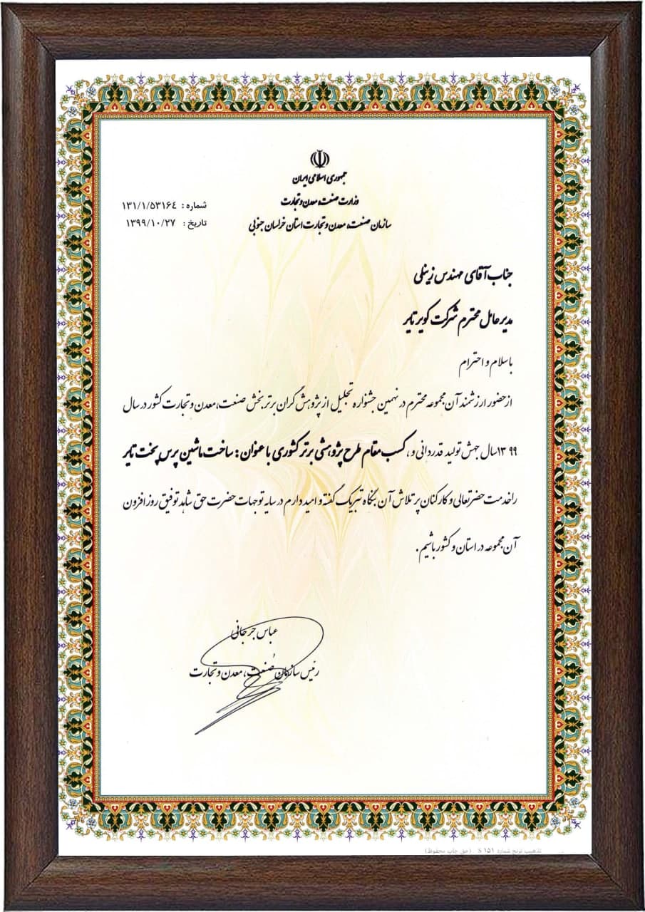 همچنین رئیس سازمان صمت استان خراسان جنوبی با اعطای تقدیرنامه به آقای مهندس زینلی از حضور ارزشمند کویرتایر در نهمین جشنواره تجلیل از پژوهشگران برتر صنعت معدن و تجارت کشور در سال 99 قدردانی و کسب مقام طرح پژوهشی برتر کشور با عنوان طراحی وساخت ماشین پرس پخت تایر را به وی و کارکنان پرتلاش شرکت تبریک گفت.