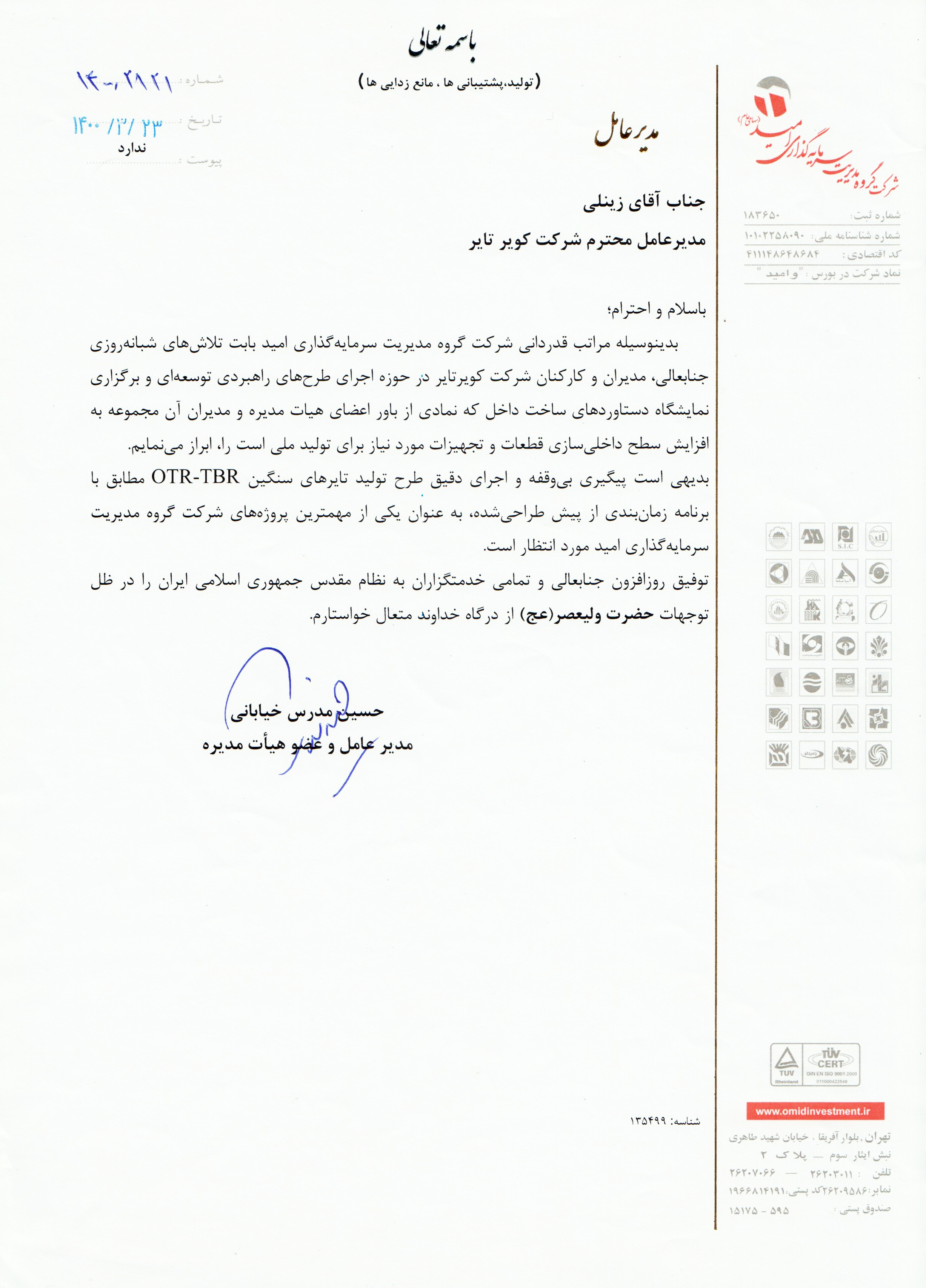 در این قدردانی آمده است:پیگیری بی وقفه و اجرای دقیق طرح تولید تایرهای سنگین OTR,TBR مطابق با برنامه زمان بندی از پیش طراحی شده به عنوان یکی از مهمترین پروژه های شرکت گروه مدیریت سرمایه گذاری امید مورد انتظار است.