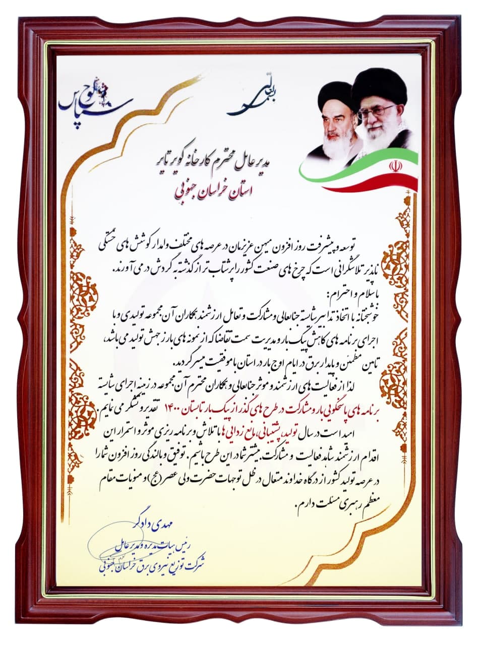 در متن لوح تقدیر اهدا شده از سوی مهندس مهدی دادگررئیس هیئت مدیره و مدیرعامل شرکت توزیع نیروی برق خراسان جنوبی آمده است:توسعه و پیشرفت روزافزون میهن عزیزمان در عرصه های مختلف، وامدار کوشش های خستگی ناپذیر تلاشگرانی است که چرخ های صنعت کشور را پرشتاب تر از گذشته به گردش در می آورند.