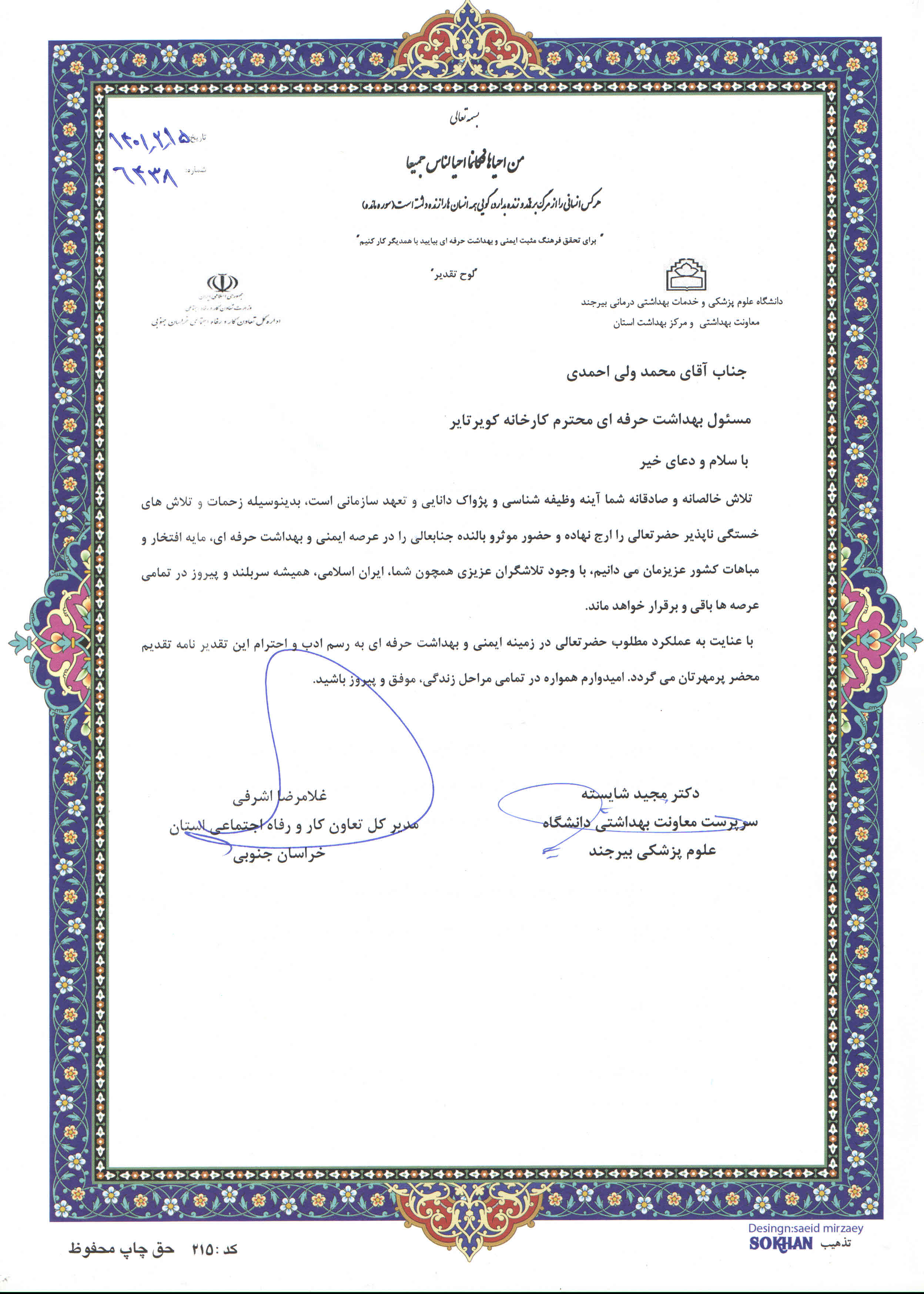 در پایان از 6 نفر بازرسان و کارشناسان بهداشت حرفه ای برگزیده شاغل در ادارات کار و شبکه های بهداشت ودرمان شهرستان های استان و همچنین 6 نفر از مسئولین بهداشت حرفه ای و ایمنی شاغل در کارگاهها وکارخانجات استان با اهدای لوح سپاس تقدیر شد.