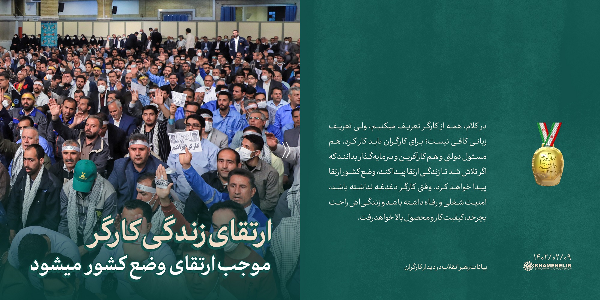 به گزارش روابط عمومی شرکت کویرتایر به نقل از پایگاه اطلاع رسانی دفتر مقام معظم رهبری ؛ رهبر معظم انقلاب اسلامی صبح امروز در دیدار بیش از هزار نفر از کارگران، اعضای تشکلهای کارگری و مسئولان وزارت تعاون، کار و رفاه اجتماعی با تأکید بر لزوم انجام شدن یک حرکت محسوس برای ارتقاء سطح زندگی کارگران، جامعه کارگری و مقابله هوشیارانه کارگران با تحریکات دشمنان را تحسین کردند و فرهنگسازی درباره «رابطه مستقیم درآمد و ثروت با کار و تلاش» را نیاز حقیقی کشور و جامعه خواندند.