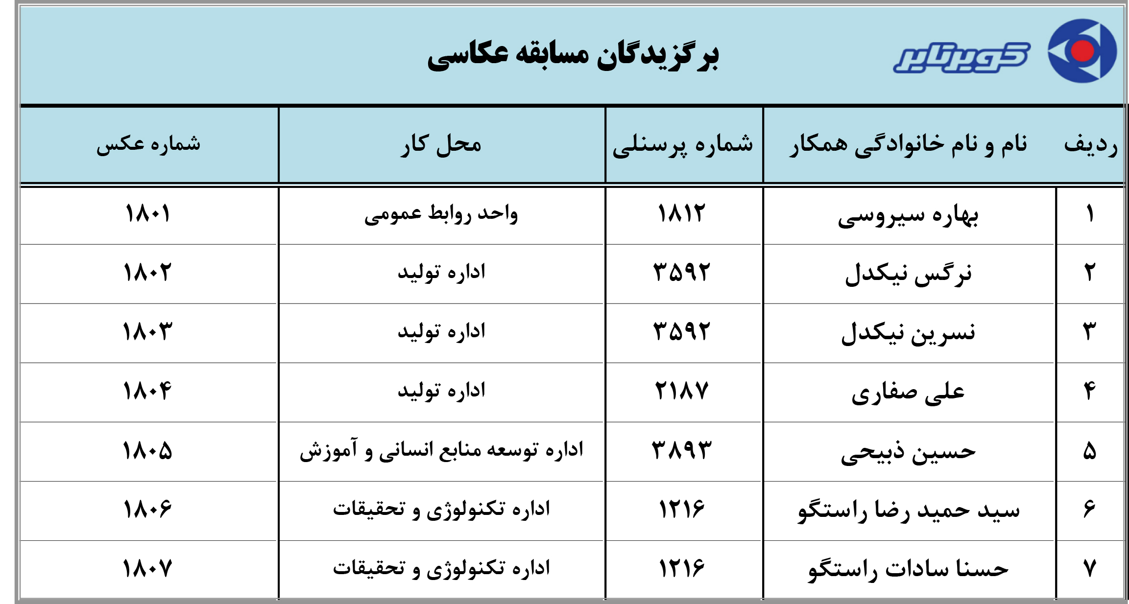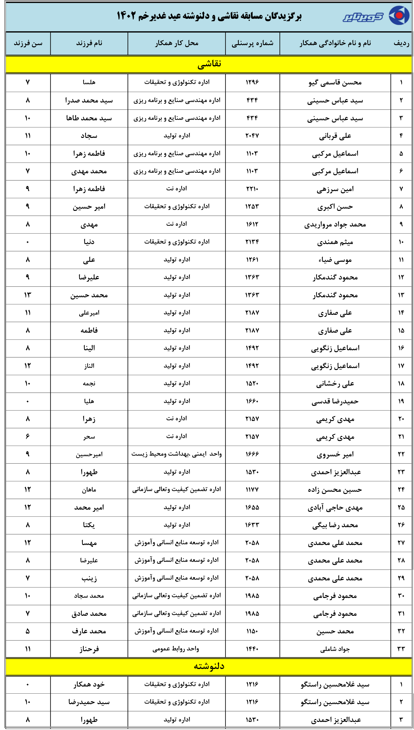 به گزارش روابط عمومی شرکت کویرتایر ،در مدت برگزاری این مسابقات فرزندان خانواده کویرتایر آثار خود در موضوعات اعلام شده را ارائه کردند که پس از بررسی و داوری آثار رسیده، برگزیدگان این مسابقات به شرح زیر انتخاب شدند: