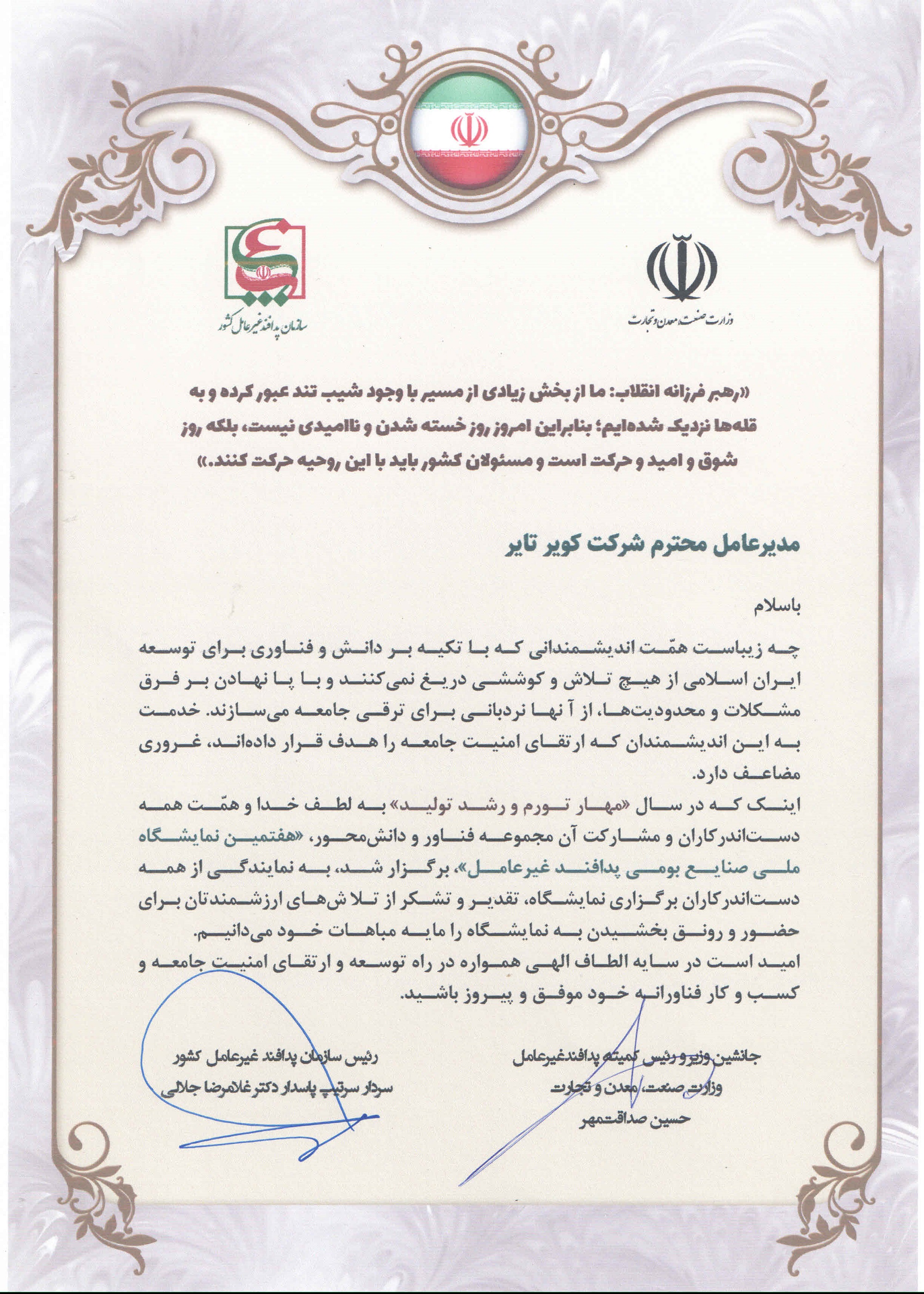 جانشین وزیر و رئیس کمیته پدافند غیرعامل وزارت صنعت،معدن و تجارت ورئیس سازمان پدافند غیر عامل کشور با اهدای لوح تقدیر به مدیرعامل شرکت کویرتایر ،از حضور ارزشمند کویرتایر در هفتمین نمایشگاه ملی صنایع بومی پدافند غیرعامل قدردانی کردند.