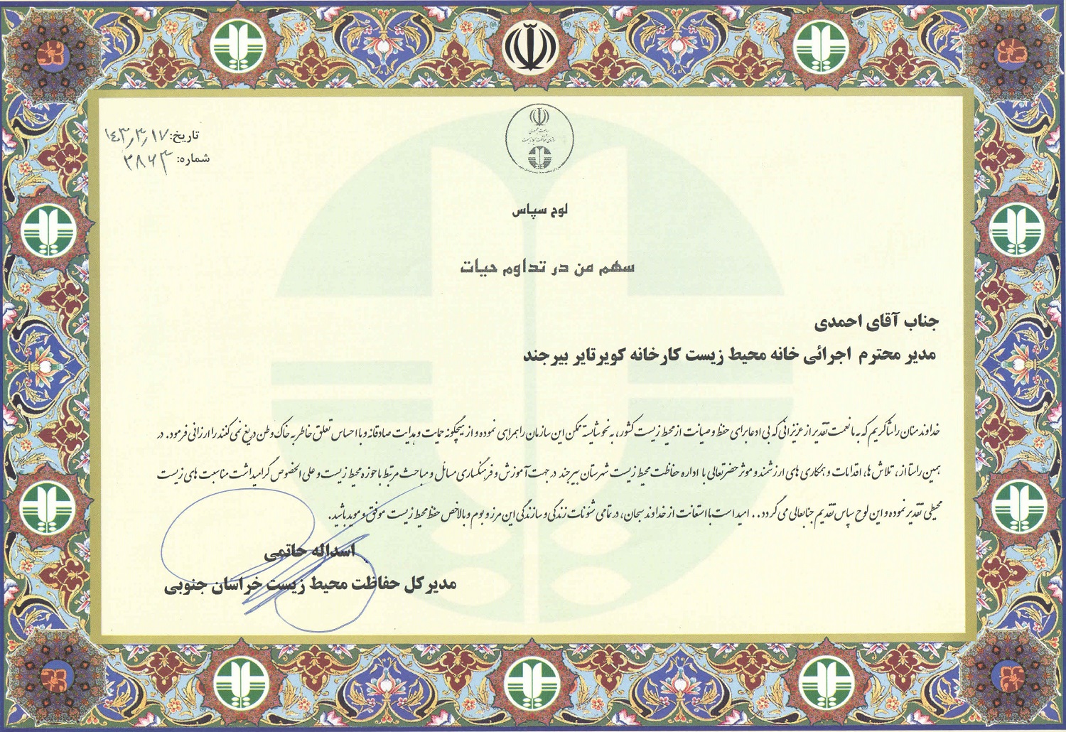 در ادامه نیز آمده است: در همین راستا از تلاش ها، اقدامات و همکاری های ارزشمند و موثر حضرتعالی با اداره حفاظت محیط زیست شهرستان بیرجند در جهت آموزش و فرهنگسازی مسائل و مباحث مرتبط با حوزه محیط زیست و علی الخصوص گرامیداشت مناسبت های زیست محیطی تقدیر نموده و این لوح سپاس نقدیم جنابعالی می گردد. امید است با استعانت از خداوند سبحان، در تمامی شئونات زندگی و سازندگی این مرز و بوم و بالاخص حفظ محیط زیست موفق و موید باشید.