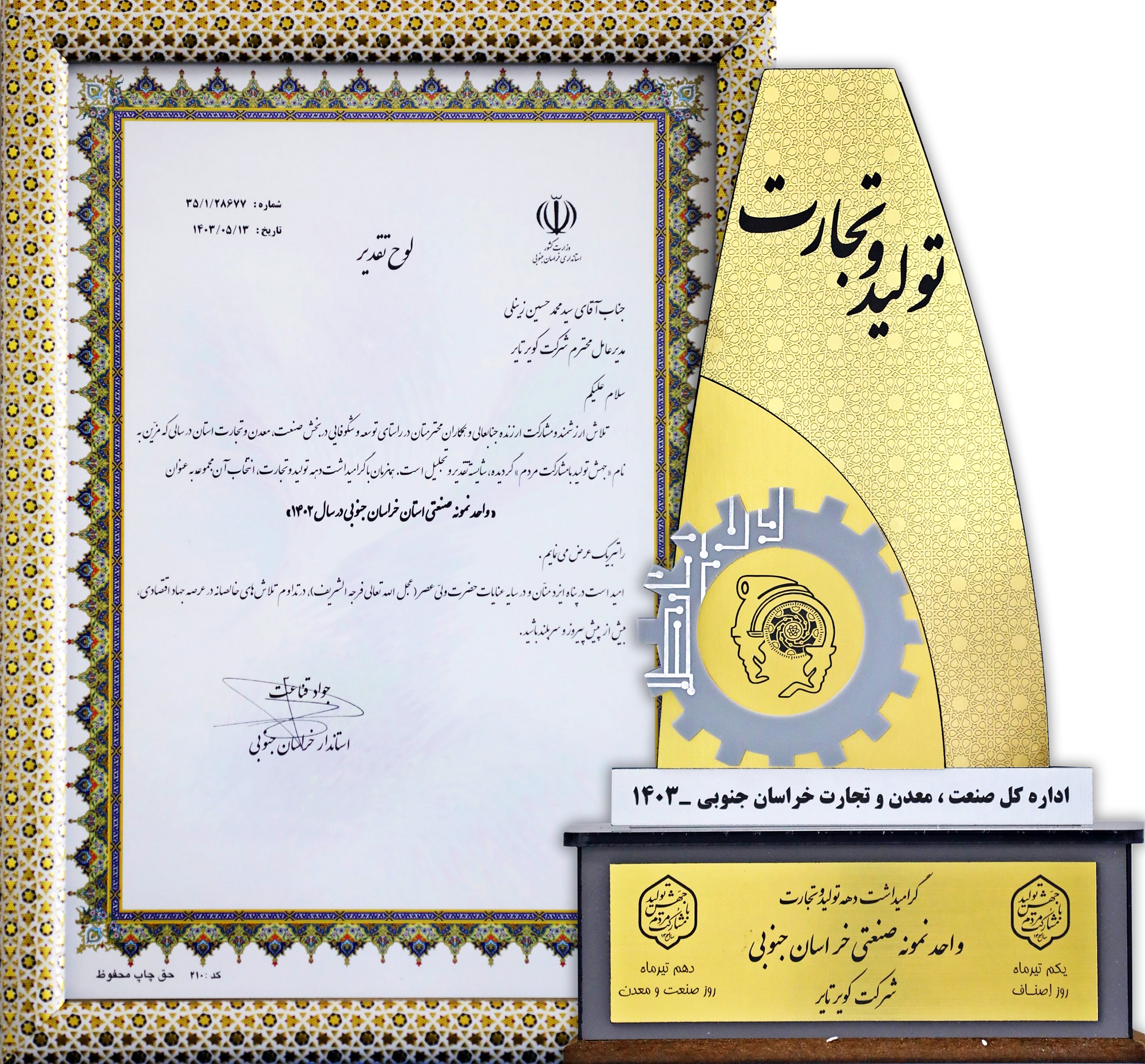 در آیین گرامیداشت دهه تولید و تجارت از شرکت دانش بنیان کویرتایر به عنوان واحد نمونه صنعتی خراسان جنوبی تجلیل شد.