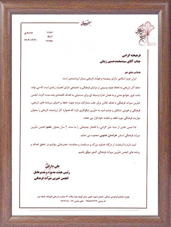 لذا ضمن تقدیر از شما خیر گرامی، با افتخار جنابعالی را به مدت 2 سال به عنوان عضو انجمن خیرین میراث فرهنگی استان خراسان جنوبی منصوب می نمایم.