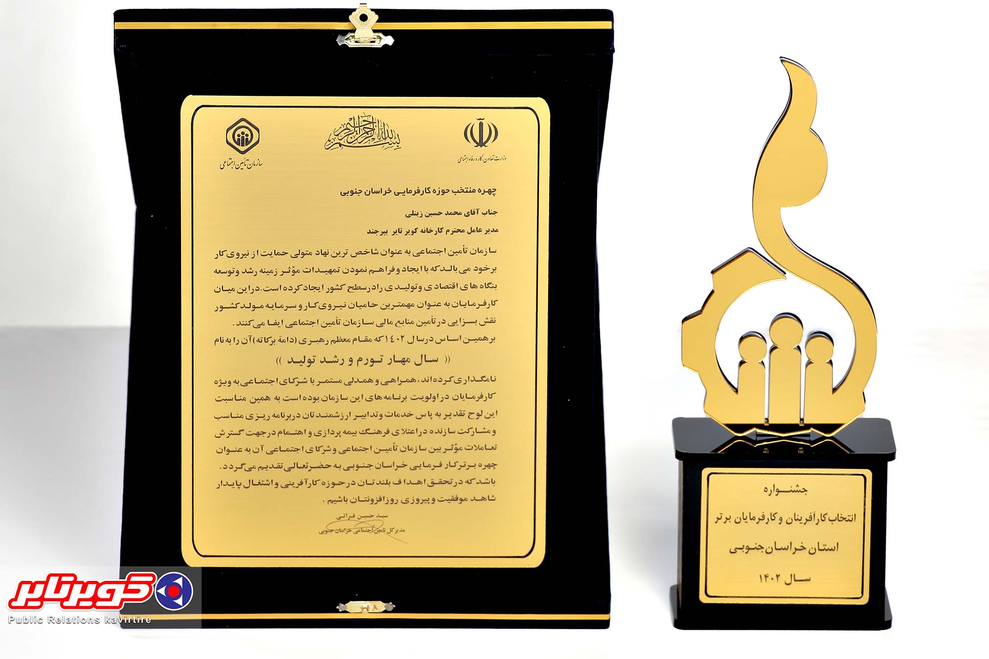 به همین مناسبت و مشارکت سازنده در اعتلای فرهنگ بیمه پردازی و اهتمام در جهت گسترش تعاملات موثر بین سازمان تامین اجتماعی و شرکای اجتماعی آن به عنوان چهره برتر کارفرمایی خراسان جنوبی به حضرتعالی تقدیم می گردد.