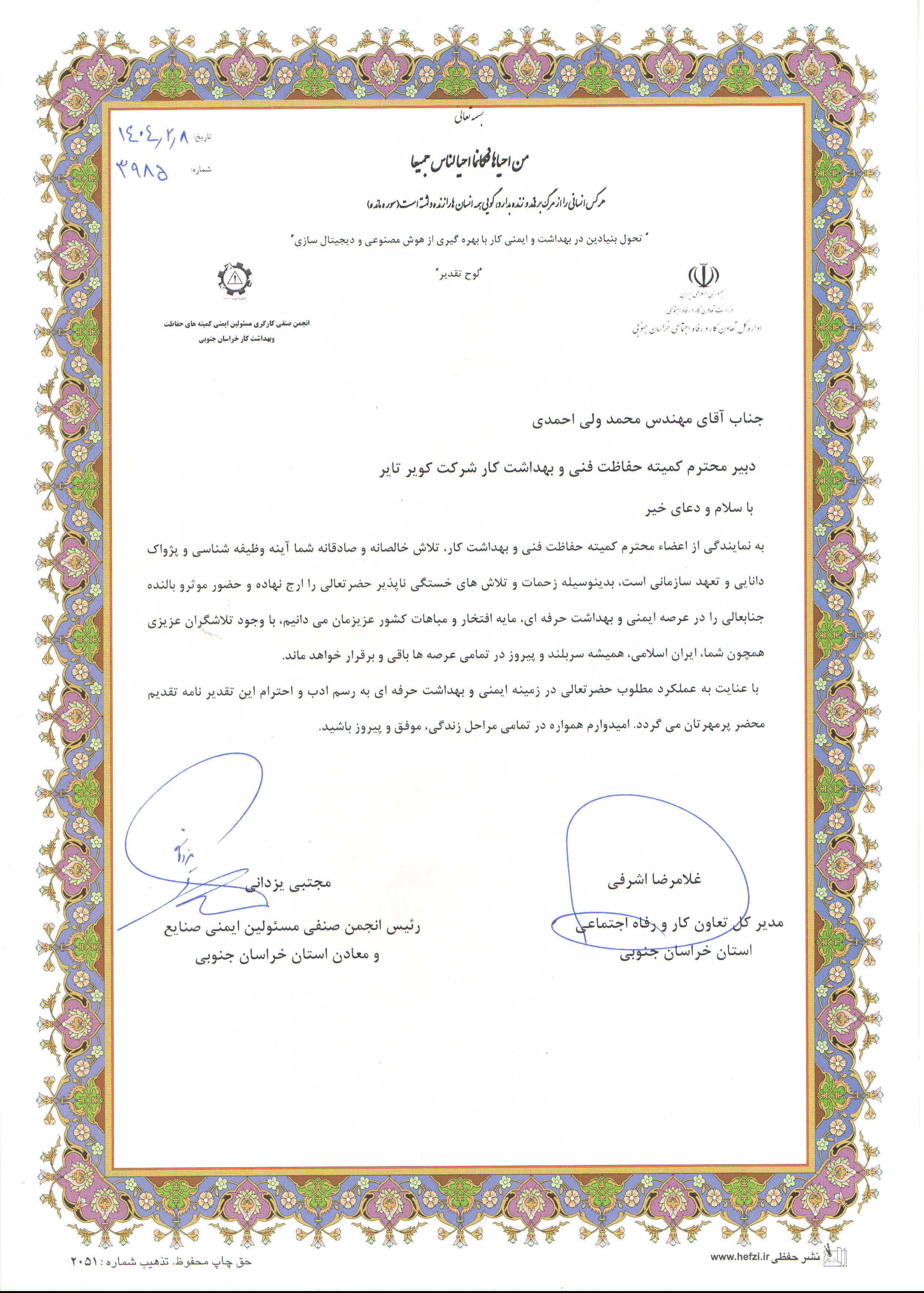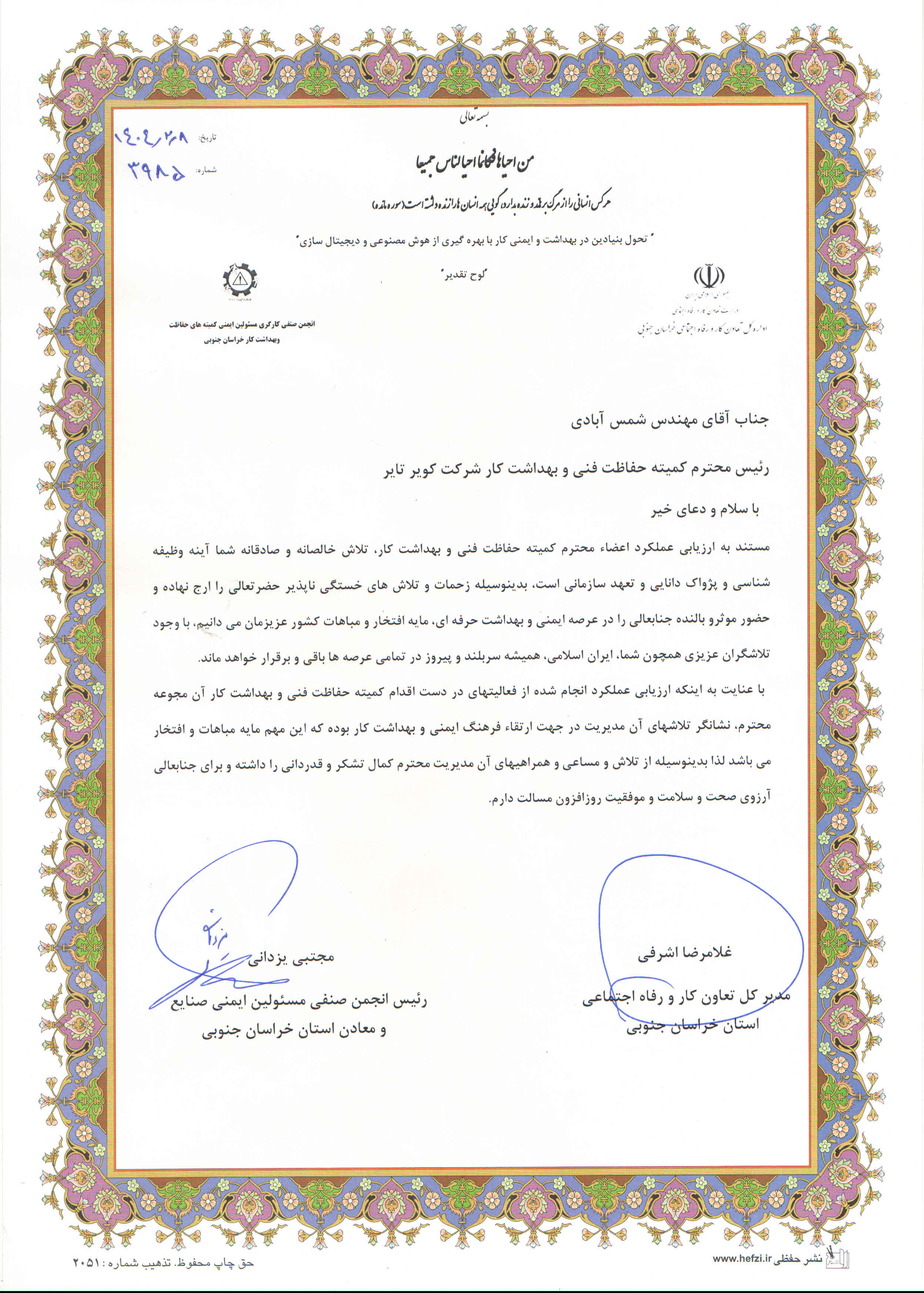 در پایان این مراسم از مهندس سیدرضا شمس آبادی رئیس کمیته حفاظت فنی وبهداشت کار و مهندس محمد ولی احمدی دبیر کمیته حفاظت فنی وبهداشت کار شرکت کویرتایر با اهدای لوح تقدیر به پاس عملکرد مؤثر در ارتقای استانداردهای ایمنی و سلامت شغلی ،تجلیل و قدردانی شد.