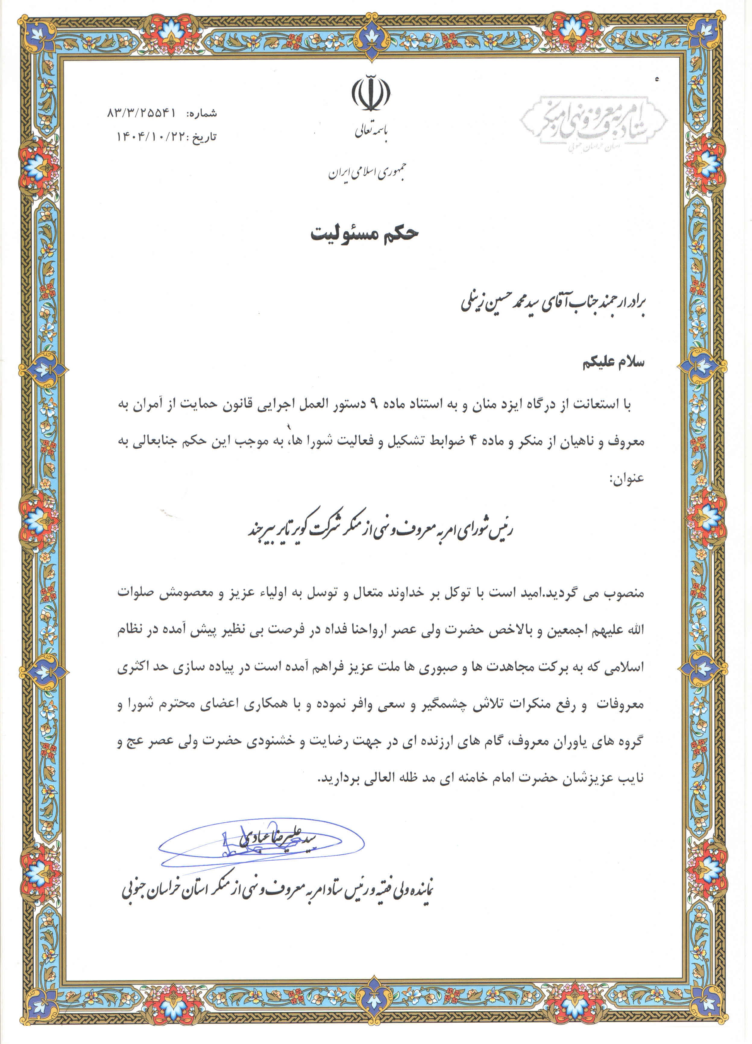 طی حکمی از سوی آیت الله سیدعلیرضا عبادی نماینده ولی فقیه و رئیس ستاد امر به معروف و نهی از منکر استان خراسان جنوبی، مهندس سید محمد حسین زینلی به عنوان رئیس شورای امر به معروف و نهی از منکر شرکت دانش بنیان کویرتایر منصوب شد.