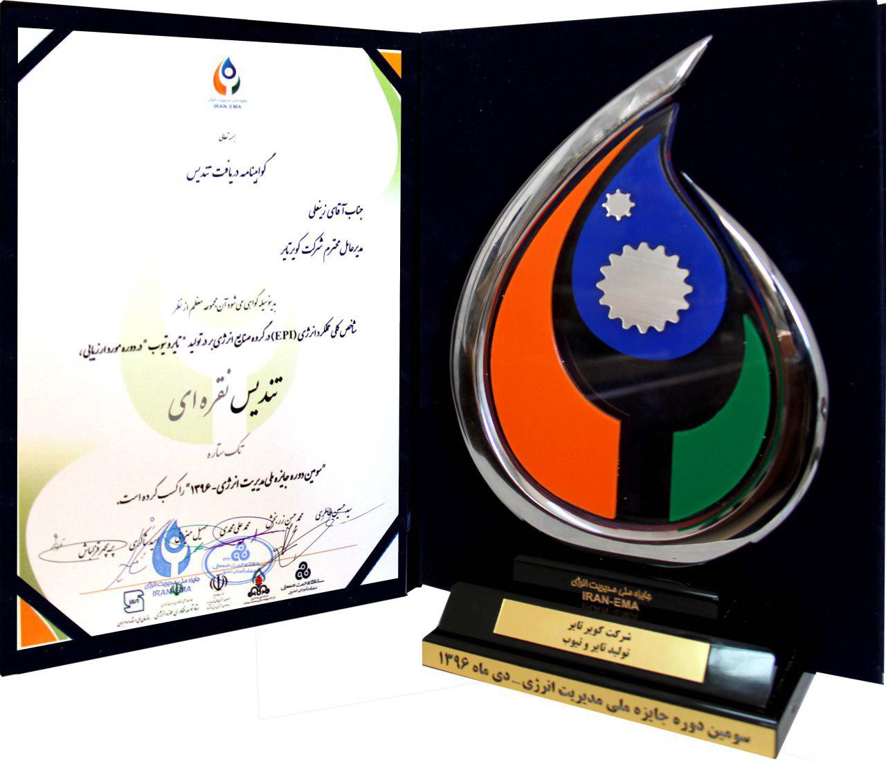 تندیس نقره ای سومین دوره جایزه ملی مدیریت انرژی ۲۳ فروردین ۱۳۹۷ ۴,۴۶۷ #کویرتایر #گواهینامهها و افتخارات #تندیس نقره ای سومین دوره جایزه ملی مدیریت انرژی