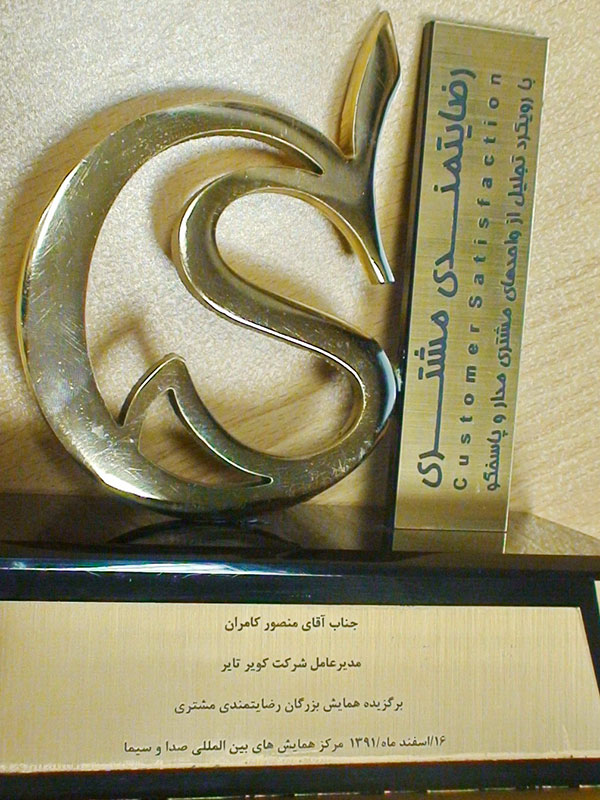 تندیس برگزیده همایش بزرگان رضایتمندی مشتری ۲۳ فروردین ۱۳۹۷ ۴,۴۸۷ #کویرتایر #گواهینامهها و افتخارات #تندیس برگزیده همایش بزرگان رضایتمندی مشتری