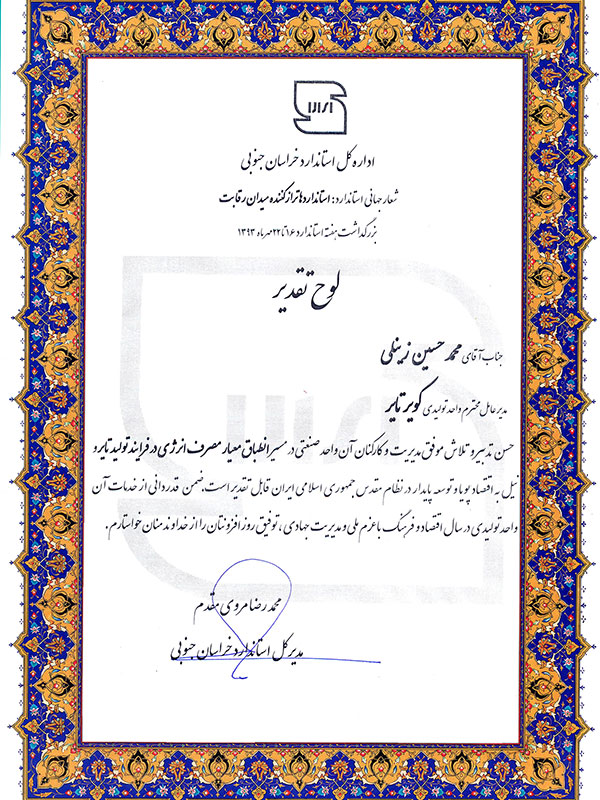 لوح تقدیر اداره کل استاندارد خراسان جنوبی