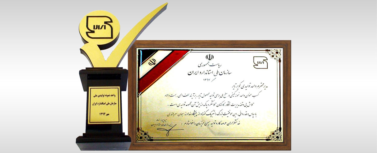 بدنبال موفقیت های روزافزون کویرتایردرحوزه تحقق استانداردهای ملی و بین المللی، امسال براساس شاخص های سازمان ملی استاندارد ایران از سوی ارزیابان استانی وکشوری مورد ارزیابی قرار گرفت وبدلیل تأمین مطلوب واثربخش کلیه شاخص های ارزیابی ابتدادرسطح استان وسپس درسطح کشور به عنوان واحد نمونه انتخاب گردید.تأمین الزامات استاندارد ملی ایران، پیاده سازی واستقراراستانداردهای بین المللی ازجمله سیستم مدیریت کیفیت براساس استانداردISO /TS۱۶۹۴۹ ، سیستم مدیریت زیست محیطی براساس استاندارد ISO ۱۴۰۰۱، سیستم مدیریت ایمنی وبهداشت حرفه ای براساس استانداردISO ۱۸۰۰۱ سیستم مدیریت انرژی براساس استانداردISO ۵۰۰۰۱ ، اخذ نشان استاندارد اروپا بنام E-Mark ، تأمین حقوق مصرف کنندگان،جلب رضایت مشتریان ونهایتاً تحقق کلیه پارامترهای کیفی وپاس نمودن کلیه آزمون های داخلی وخارجی محصولات کویرتایر ازجمله دلایل دریافت این نشان پرافتخار بوده است.نهادینه شدن رعایت حقوق مصرف کنندگان،رعایت موازین گارانتی محصول وارائه خدمات پس ازفروش واستمرارگواهینامه های فوق دربیش ازیک دهه ازدیگردلایل ممتاز شدن وانتخاب کویرتایربه عنوان واحدنمونه استاندارد در سطح ملی می باشد. کویرتایر در سال ۹۴ به عنوان تنها واحد نمونه استاندارد کشوردر صنعت تایر واز جمله ۱۰واحد نمونه ملی بوده است.
