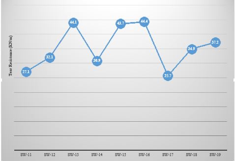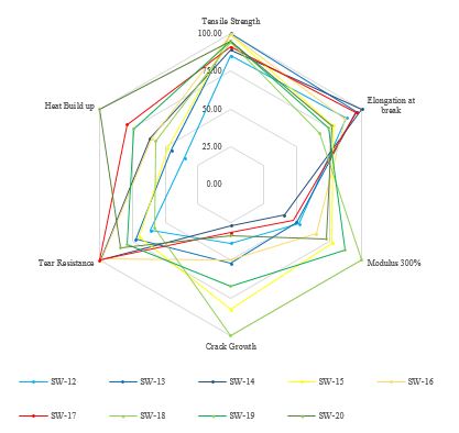 با توجه به مباحث فوق میتوان نتیجه گرفت که جهت بهبود مقاومت پارگی میبایست درصدترکیب سیلیکا را افزایش داد و این بهبود به وضوح در فرمولاسیونهای 13، 15 و 16 مشهود است. لیکن این افزایش از جهتی حرارتاندوزی آمیزه را افزایش میدهد؛ در نتیجه از فرمولاسیونهای فوق ارجحیت با فرمولاسیون 13 و 15 بوده که در فرمولاسیون 13 اثر متقابل سیلیکا و دوده باعث کاهش بیشتری در رشد ترک شده است. در نهایت با توجه به کلیه بحثهای انجام شده میتوان نتیجه گرفت که نقطه بهینه از نظر خواص مقاومت پارگی، رشد ترک و حرارتزایی آمیزه؛ فرمولاسیون SW-13 یعنی 15 PHR الترازیل و 30 PHR دوده N-660 در 70 PHR کائوچوی طبیعی و 30 PHR کائوچوی مصنوعی BR میباشد. البته این فرمولاسیون از نظر سیستم پخت اصلاح گردید و پارامترهای پخت و مدولوس آن درحد استاندارد قرار گرفت.