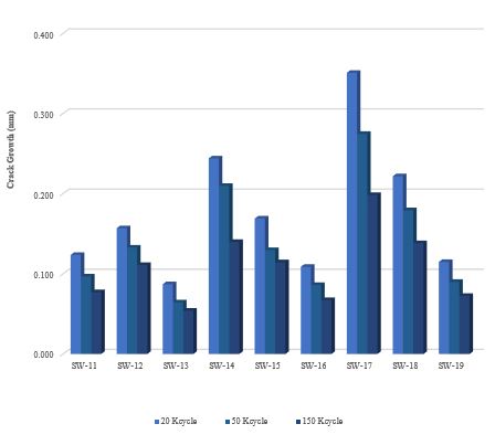نمودار 3 - رشد ترک آمیزهها در سه مرحله 20، 50 و 150 هزار دور