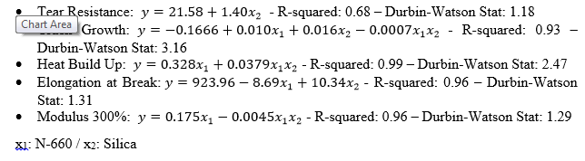 نکته: اگر R-squared بالای 0.4 باشد مدل قابل قبول؛ بالای 0.7 خوب و بالای 0.94 عالی است. به همین صورت Durbin-Watson Stat بالای 1 قابل قبول؛ بالای 1.2 خوب و بالای 1.7 بسیارخوب است. (استحکام کششی رابطه مشخصی با درصد ترکیب پرکنندهها نداشت؛ زیرا پارامترهای R-squared و Durbin-Watson Stat نامناسب بودند.)