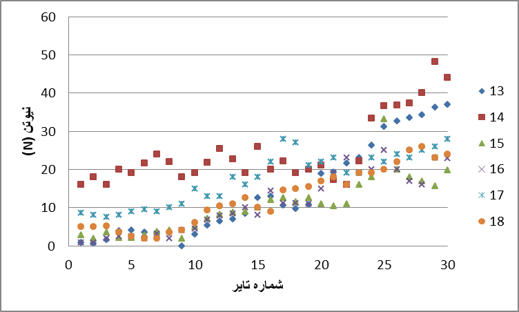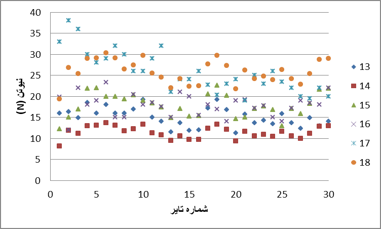 شکل 1 اثر میانگین تغییر نیروی شعاعی را برای 30 حلقه تایر در سایزهای 13 تا 15 اینچ نشان می دهد. همانطور که مشاهده می گردد با گذشت زمان و سرد شدن تایر تغییر نیروی شعاعی کاهش پیدا کرده و بهبود می یابد.