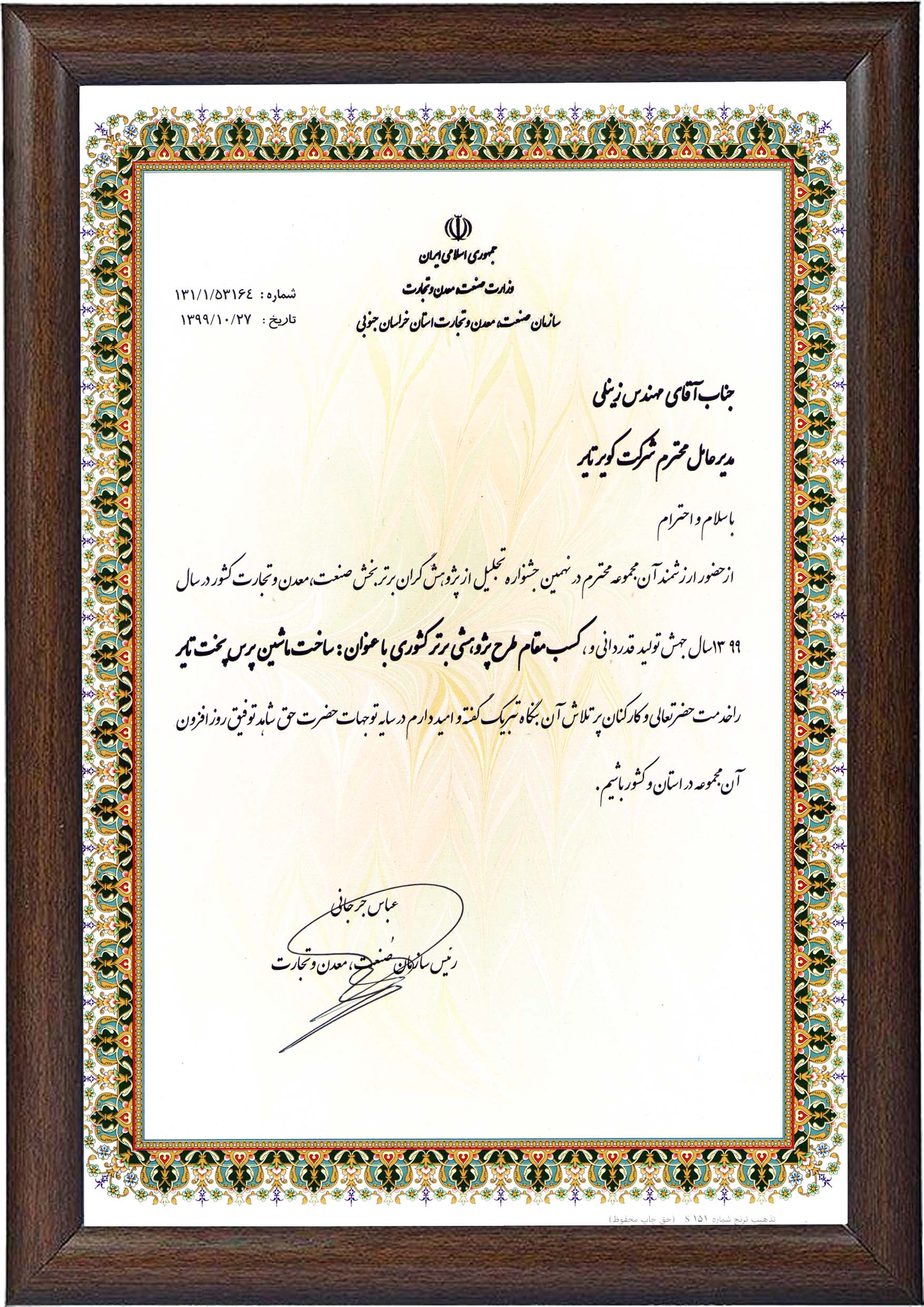 انتخاب واحد پژوهشی برتر کشور با عنوان ساخت ماشین پرس پخت تایر ۱۱ تیر ۱۴۰۱ ۲,۰۲۱ . #گواهینامه و افتخارات 1400