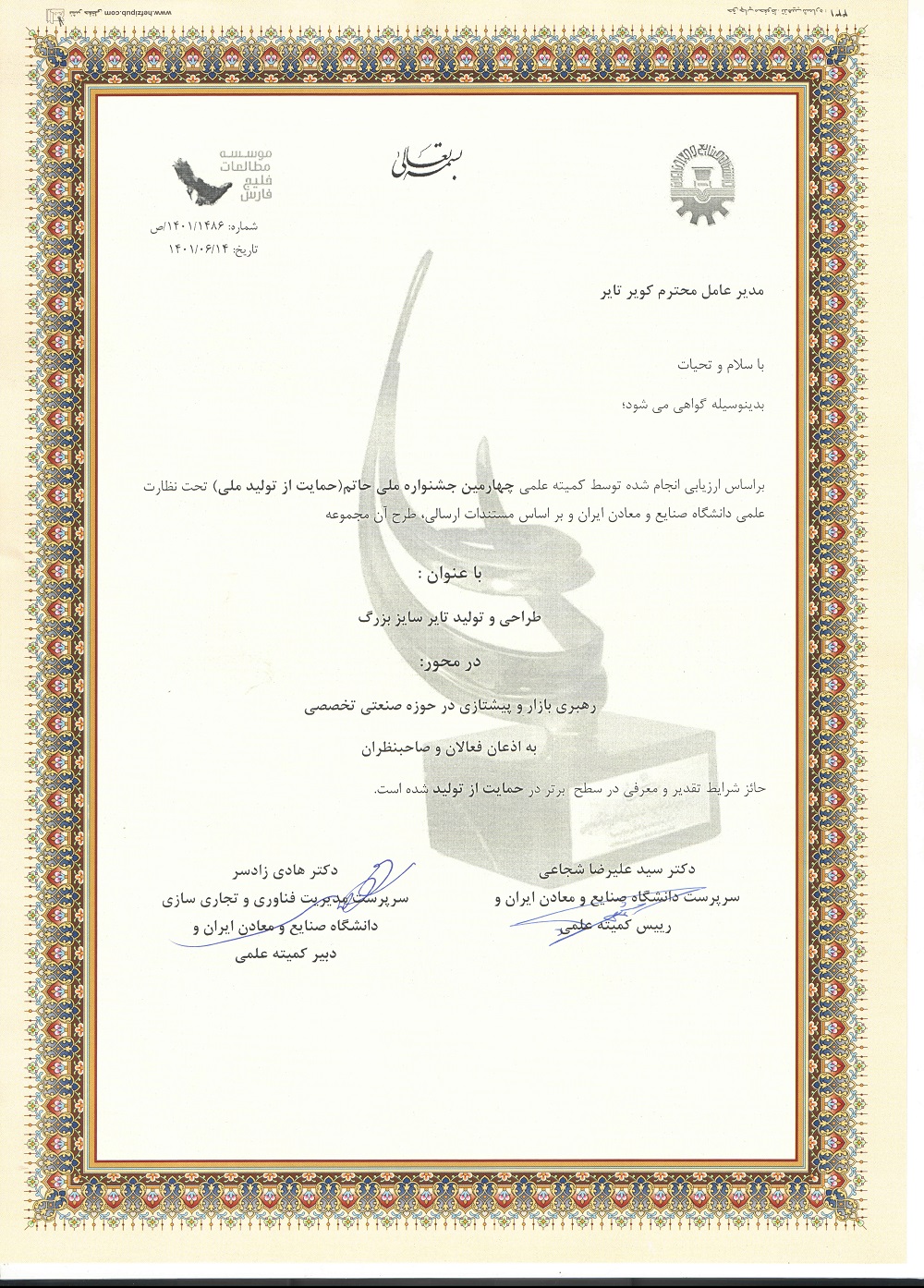 دریافت تندیس و لوح تقدیر چهارمین جشنواره ملی حاتم (حمایت از تولید ملی) ۲ اسفند ۱۴۰۱ ۳,۵۶۹ #گواهینامه و افتخارات 1401