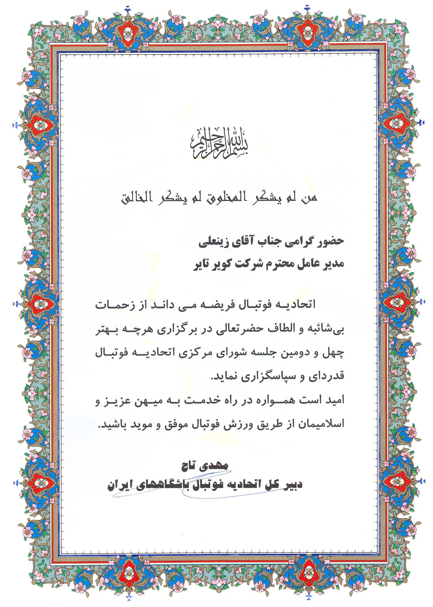 اعطای لوح قدردانی از سوی مهندس تاج دبیر کل اتحادیه فوتبال باشگاههای ایران از مدیریت محترم عامل ۲۳ مرداد ۱۳۹۹ ۲,۲۶۳ #گواهینامه و افتخارات سال 1377