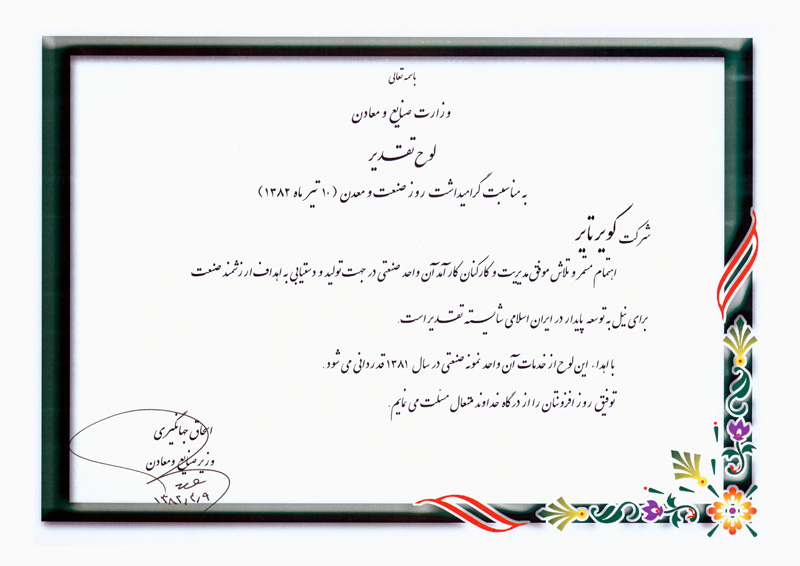اعطای لوح تقدیر واحد نمونه صنعتی سال 81 کشور از سوی مهندس جهانگیری وزیر صنایع و معادن ۲۳ مرداد ۱۳۹۹ ۱,۱۵۹ #گواهینامه ها و افتخارات سال 1381