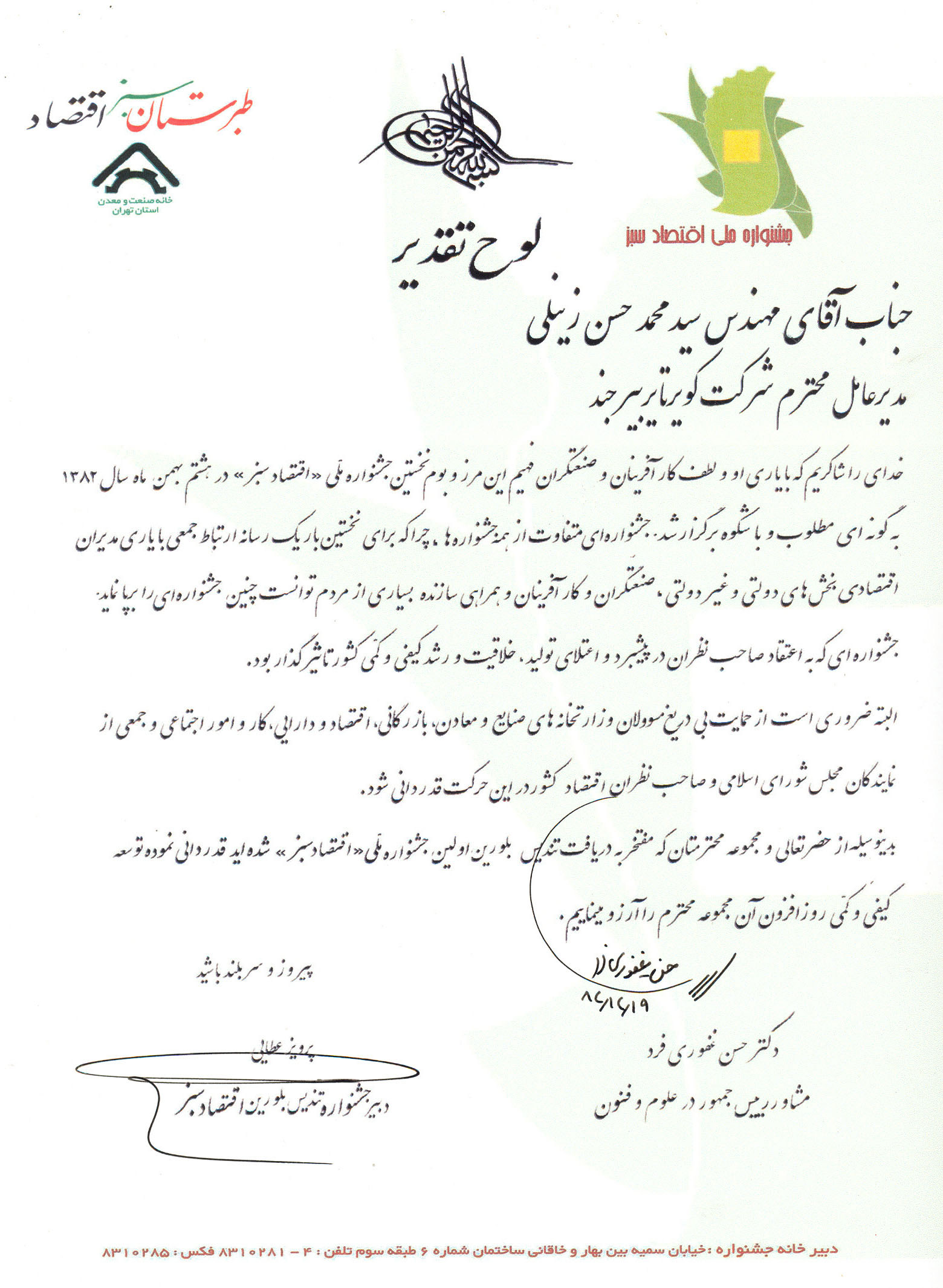 اعطای لوح تقدیر و تندیس نخستین جشنواره ملی اقتصاد سبز از سوی دکتر حسن غفوری فرد به مدیرعامل ۲۳ مرداد ۱۳۹۹ ۸۴۰ #گواهینامه ها و افتخارات سال 1382