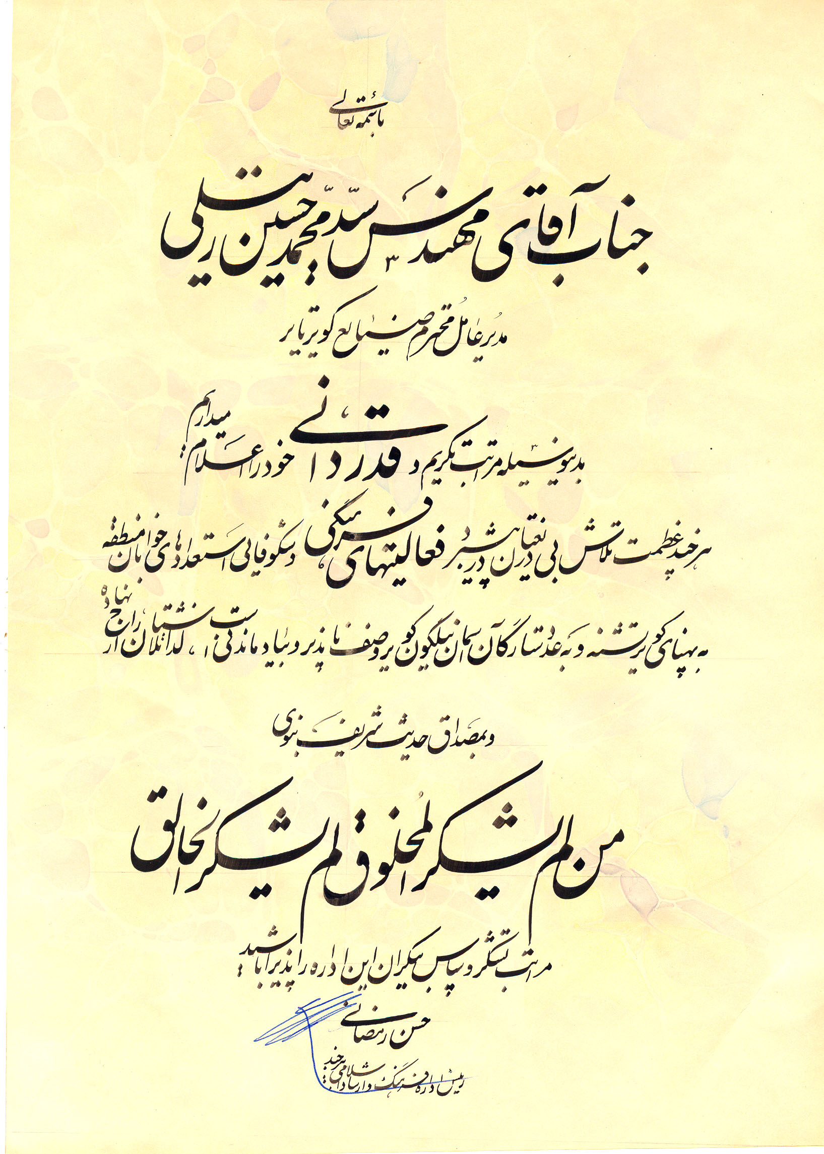 اعطای لوح قدردانی از سوی رییس اداره فرهنگ و ارشاد اسلامی بیرجند به مدیرعامل ۲۳ مرداد ۱۳۹۹ ۱,۳۰۵ #گواهینامه ها و افتخارات سال 1382
