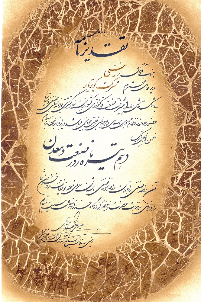 اعطای لوح تقدیر رییس سازمان صنایع و معادن خراسان جنوبی به مدیرعامل ۲۳ مرداد ۱۳۹۹ ۱,۶۳۷ #گواهینامه ها و افتخارات سال 1383