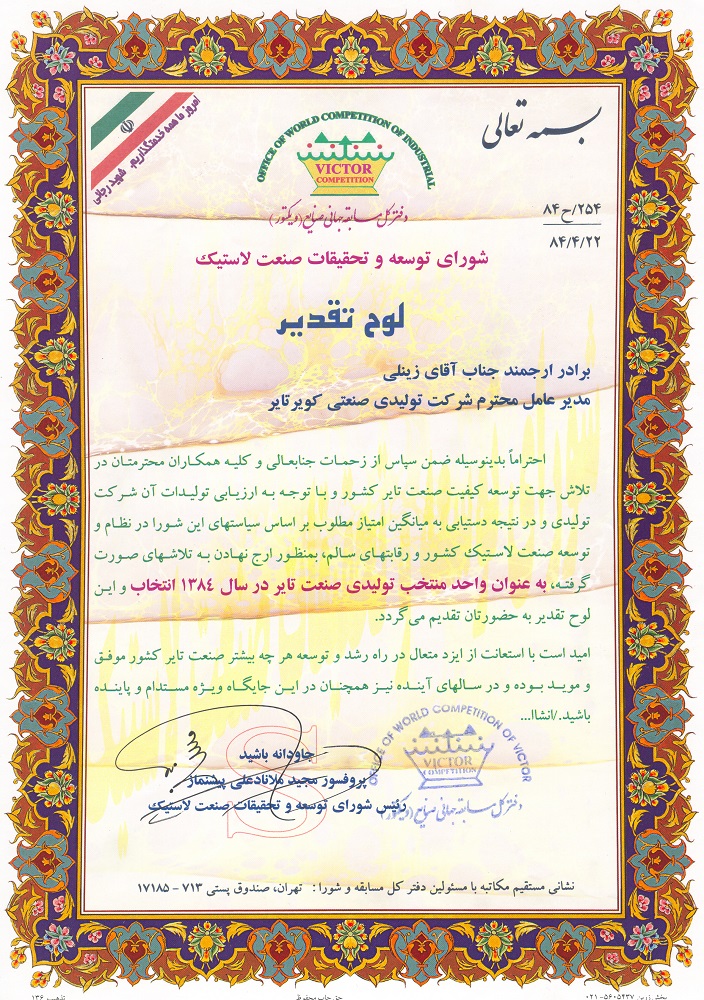 اعطای لوح تقدیر رئیس شورای توسعه و تحقیقات صنعت لاستیک به عنوان واحد نمونه صنعتی تایر ۲۳ مرداد ۱۳۹۹ ۱,۳۷۷ #گواهینامه ها و افتخارات سال 1384