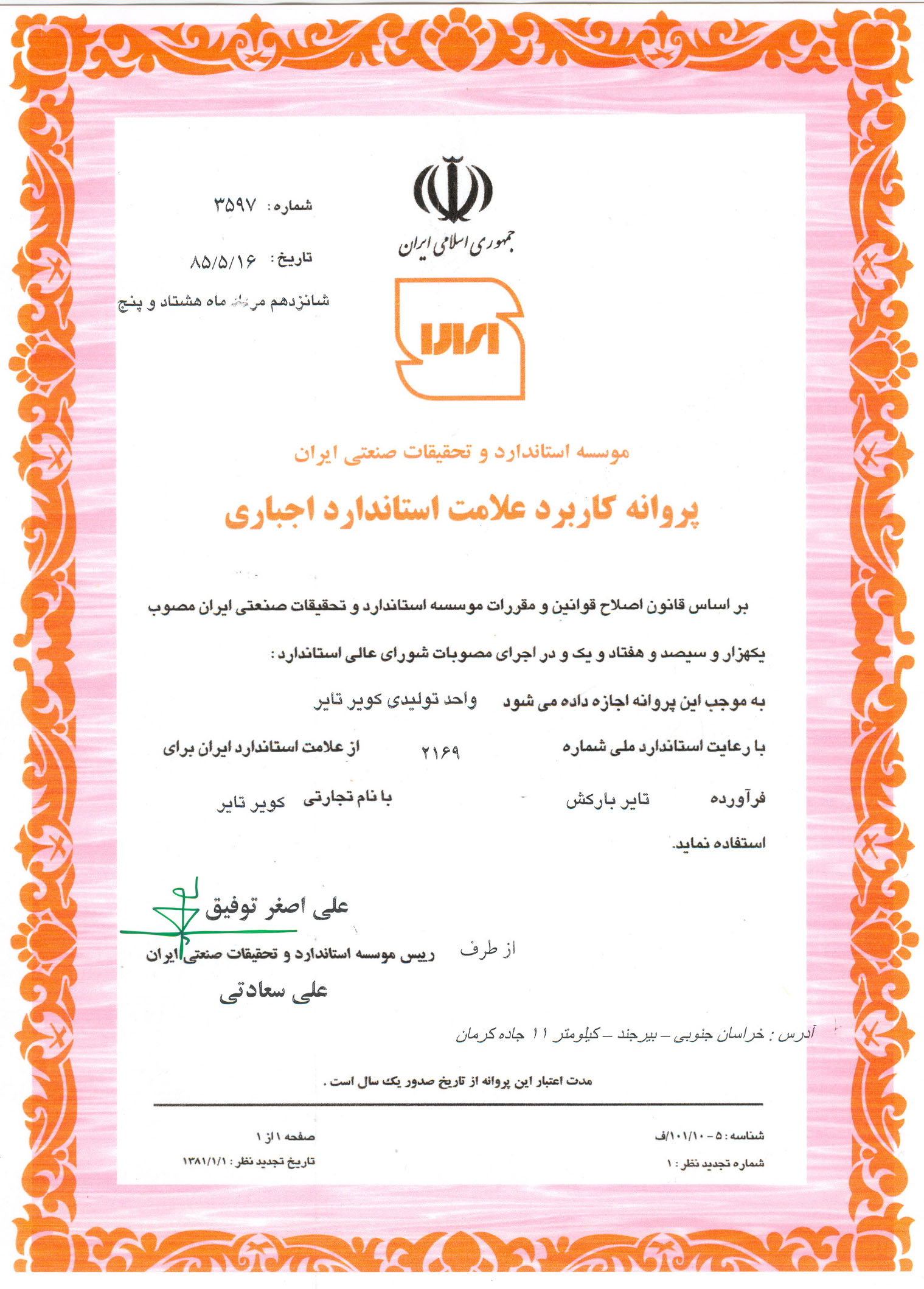 اعطای پروانه کاربرد علامت استاندارد اجباری شماره 2169 از سوی مؤسسه استاندارد و تحقیقات صنعتی ایران ۲۳ مرداد ۱۳۹۹ ۱,۶۶۴ #گواهینامه ها و افتخارات سال 1385