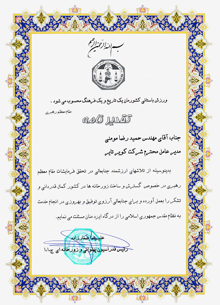 تقدیر رییس ورزشهای زورخانه ای کشور از مدیرعامل شرکت در خصوص گسترش و ساخت زورخانه ۲۹ مرداد ۱۳۹۹ ۱,۵۲۹ #گواهینامه ها و افتخارات سال 1386