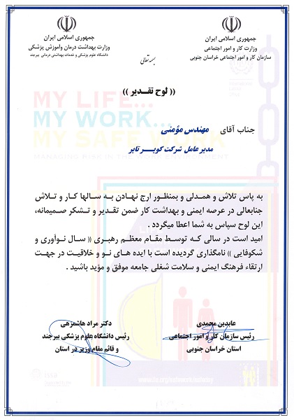 انتخاب و معرفی به عنوان واحد نمونه وفعال در عرصه ایمنی وبهداشت در سطح استان ۲۹ مرداد ۱۳۹۹ ۲,۱۶۱ #گواهینامه ها و افتخارات سال 1387