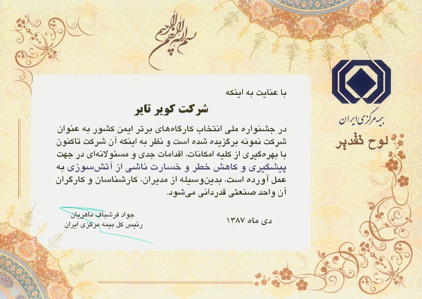 انتخاب و معرفی به عنوان واحد نمونه کشوری در زمینه پیشگیری از آتش سوزی از سوی بیمه مرکزی ایران ۲۹ مرداد ۱۳۹۹ ۲,۳۹۰ #گواهینامه ها و افتخارات سال 1387