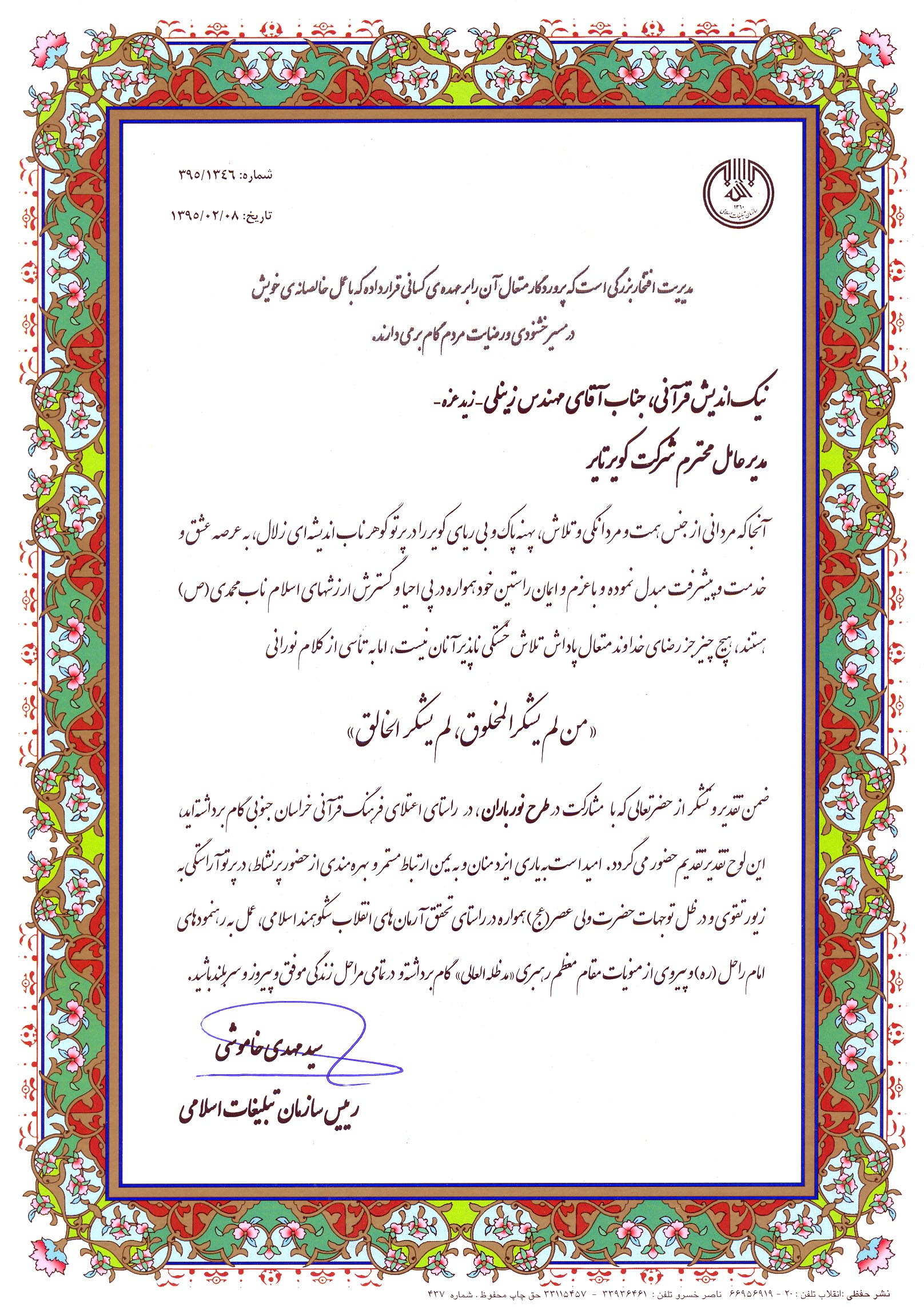 اعطای لوح تقدیر ریاست سازمات تبلیغات اسلامی کشور به مدیرعامل برای مشارکت در طرح نورباران ۶ آبان ۱۳۹۹ ۱,۶۳۶ #1395