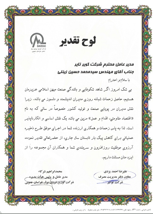 اعطای لوح واحد نمونه استانی در اجرای موفق طرح ذخیره عملیاتی برای کاهش پیک بار در تابستان 94 ۶ آبان ۱۳۹۹ ۱,۲۵۷ #1395