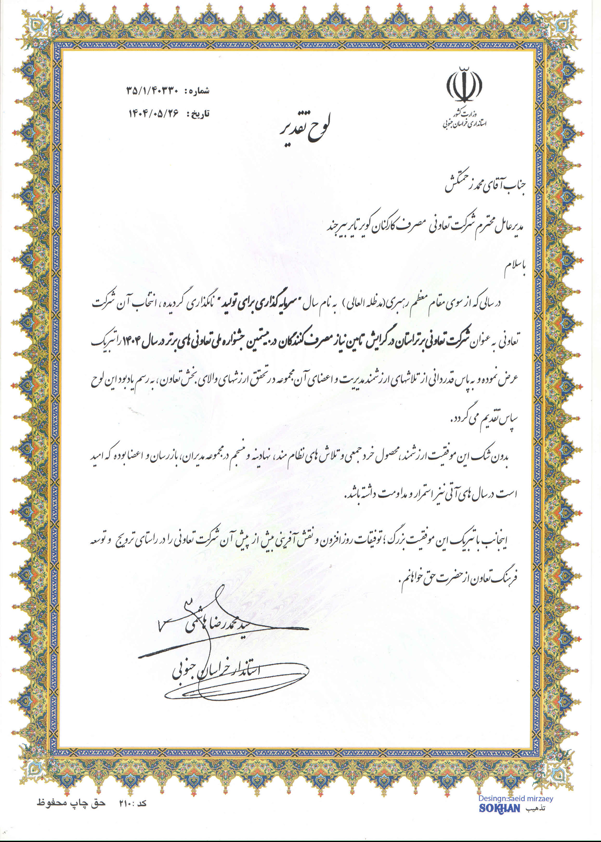 در سالی که از سوی مقام معظم رهبری (مدظلهالعالی) بهنام سال" سرمایه گذاری در تولید" نامگذاری گردیده، انتخاب آن شرکت تعاونی بهعنوان شرکت تعاونی برتر استان در گرایش تأمین نیاز مصرفکنندگان در بیستمین جشنواره تعاونیهای برتر در سال ۱۴۰۴را تبریک عرض وبه پاس قدردانی از تلاشهای ارزشمند مدیریت واعضای آن مجموعه در تحقق ارزشهای والای بخش تعاون به رسم یادبود این لوح سپاس تقدیم می گردد.